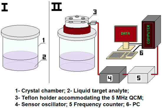 The proposed system for alcohol quality assessment is composed of a 500 mL crystal chamber with removable sheet-iron lid, a 5 MHz metal–phenolic film-coated QCM (MPF-QCM) placed in a Teflon holder firmly attached to a second sheet-iron lid, a Maxtek sensor oscillator, a frequency counter HM 8123 and a personal computer (PC), as illustrated in Figure 1. Initially, 100 mL of a given target analyte (here, water, ammonium hydroxide, petroleum ether, ethanol, methanol and isopropanol) were poured into the chamber and left for 10 min until liquid–vapor thermodynamic equilibrium was reached (saturated vapor pressure), ensuring the presence of 100% pure target gas in the surroundings above the liquid. Simultaneously, the QCM was gently fixed in the holder, electrically connected to the oscillator and frequency counter, and left to stabilize its resonance frequency (∆fair ≤ ±1 Hz/s).