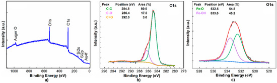 The probing of the QCM’s surface reveals six primary chemical elements, including carbon, oxygen, silicon, gold, iron and chlorine, associated with the quartz crystal–gold electrode structure of the microbalance and hydrocarbon–iron chloride species due to the metal–phenolic treatment. Interestingly, the atomic percentage of Fe and Cl in the area without FeCl3 particles (see Table 1) correlates to that disclosed in ref. [47], but these elements are not registered by the XPS. Perhaps its short beam penetration depth blocks the access to Fe atoms, longitudinally arranged between underlying and overlying phenol molecules [44]. Nonetheless, the C-C and C-O peaks in the C1s spectrum, along with the Fe-O and F-OH functionalities appearing at ~532.5 eV and ~533.5 eV in the O1s core level, confirm the deposition of a metal–phenolic coating. Fe-O bonding occurs by coordination among phenol and iron, whereas Fe-OH groups are ascribed to hydrogen bonding with water molecules [44,47].