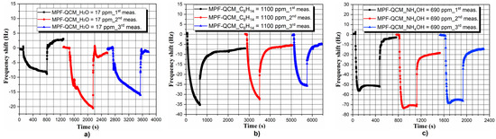 Repeatability and reversibility of the MPF-QCM’s response to saturated (a) water, (b) ammonium hydroxide and (c) petroleum ether vapors at Tair = Tliquid ~ 20 ± 2 °C.