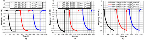 Repeatability and reversibility of the MPF-QCM’s response to saturated (a) methanol, (b) ethanol and (c) isopropanol vapors at Tair = Tliquid ~ 20 ± 2 °C.