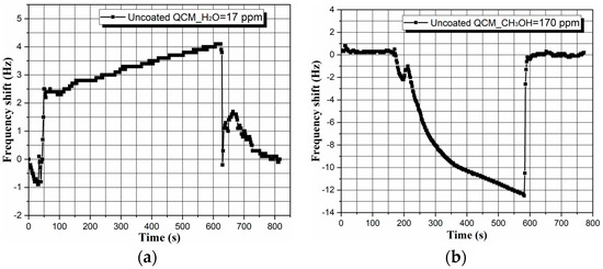 Sensor response of an uncoated 5 MHz QCM towards saturated (a) water and (b) methanol vapors at Tair = Tliquid ~ 20 ± 2 °C.