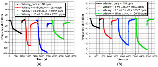 Considering the good selectivity, repeatability and reversibility of the MPF-QCM, its efficiency as a detector of methyl and isopropyl alcohol in spirits is studied and presented in Figure 8. The initially low vol.% of methyl in the whisky triggers frequency downshifts, but eventually, the cumulative methanol content leads to frequency upshifts (see Figure 8a), because methanol is lighter than ethanol. Resultantly, the larger the methyl fraction in the saturated vapor mixture, the smaller the total molecular mass. In other words, the continuous replacement of heavier gas molecules with lighter ones displaces the resonance frequency upwards, in perfect agreement with the operation principles of the QCM [22].