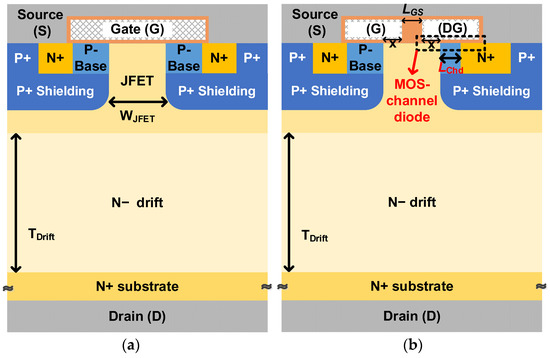 Schematic cross-section views of (a) conventional SiC MOSFET and (b) the proposed SiC MOSFET.