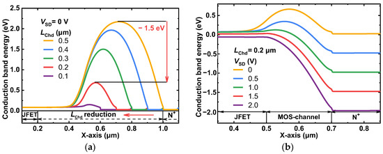 The positive dummy gate bias (VSD) and the channel length of the MOS-channel diode (LChd) are two characteristics that are essential for lowering the potential barrier. The dependence of the MOS-channel diode conduction band distribution and the SiC/oxide interface on LChd and VSD are shown in Figure 2a,b, respectively. When LChd is reduced from 0.5 μm to 0.2 μm, the electron potential barrier can be reduced by 1.5 eV at zero bias, and when VSD is increased, the electron potential barrier could also be decreased significantly. Therefore, in the proposed SG SiC MOSFET, the intrinsic body PiN diode could be completely suppressed by a low cut-in voltage MOS-channel diode. To analyze and describe the barrier-lowering effect induced by LChd and VSD of the MOS-channel diode, a compact analytical model is proposed as follows: