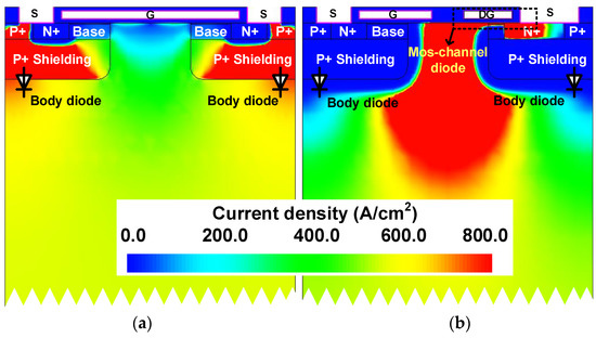 Total reverse current density distribution at ISD = 11 A (550 A/cm2) of the (a) conventional MOSFET and (b) the proposed MOSFET.