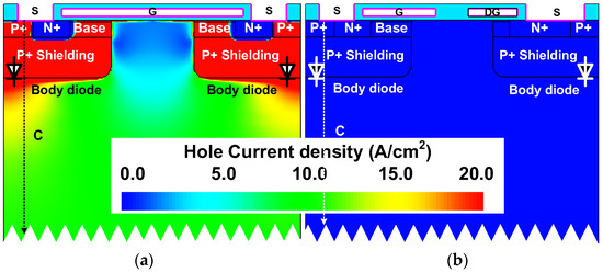 The source-to-drain current density distributions at a rated current of 11 A (550 A/cm2) of both studied devices are compared in Figure 5. Unlike the Conv. MOS, the body diode is inactivated, and the reverse current is conducted through the MOS-channel diode in the proposed MOSFET. Figure 6 shows the hole current density distributions of the two studied MOSFETs. The Prop. MOS can prohibit the hole injection from the P+ shielding region into the n-type layer. To further demonstrate this, the hole density along with line C are revealed in Figure 7. The hole density in the drift region of the proposed MOSFET is in the order of around 108, while the conventional one is 1016. The extremely low minority carrier concentration in the drift region of the proposed device demonstrates the inactivation of hole–electron recombination, which will trigger bipolar degradation.
