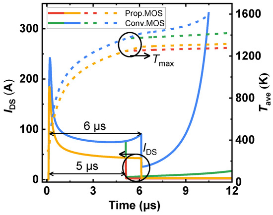 Figure 14 shows the short-circuit (SC) behaviors of two studied MOSFETs using electro-thermal simulations (VGS of 15 V and VDS of 800 V). The IDS and average lattice temperature (Tave) waveforms indicate that the Prop. MOS has superior SC ruggedness [35,36]. This is because the MOS-channel diode lowers the effective channel density. The peak drain current of the Prop. MOS is thus 23.7% lower than that of the Conv. MOS (decreases from 241 A to 184 A), despite the increased Ron,sp. As a result, the SC withstand time of the Prop. MOS is higher than the Conv. MOS, which failed for thermal runaway at 6 μs.