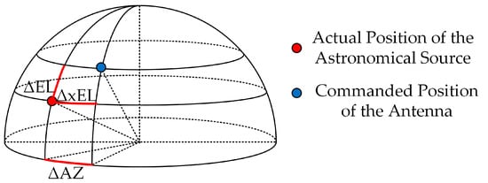 By driving azimuth and elevation mechanisms to rotate around the azimuth axis and the elevation axis separately, the antenna reflector can be pointed at the astronomical source to be observed. If there is a deviation between the commanded position of the antenna and the actual position of the astronomical source, then the radio telescope has an antenna pointing error, as shown in Figure 2. Pointing error has two components: elevation error and azimuth error (or cross-elevation error). In order to ensure the sensitivity and resolution of radio telescopes, it is desirable that the antenna pointing error should not exceed 1/10 of the beam width (half power beam width, HPBW) [], which brings strict requirements for radio signal observation above the centimeter wavelength band. For example, when operating at 100 GHz, a pointing accuracy of 1″ is reasonable.