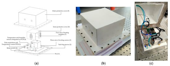 The high-precision biaxial inclinometer’s absolute accuracy is significantly affected by the level of its installation, as well as the ambient temperature and humidity during measurement. For this experiment, we utilized the LEICA Nivel-210, a commercially available two-axis precision inclination sensor with a resolution of 0.001 mrad. The main technical parameters of the sensor are listed in Table 1. To maintain optimal measurement accuracy, a flatness tolerance within 0.01 mm and a platform inclination of ±1.51 mrad are required. The sensor’s operational temperature range is −20 °C to 50 °C, with a zero-point error of 0.005 mrad induced by every 1 °C of temperature drift. The seasonal temperature range at Nanshan Observatory, located in Urumqi, China, spans from −40 °C to 60 °C. The significant disparity in temperature can have a notable impact on the precision of inclinometer measurements and may even result in irreparable harm to its internal optical components. Therefore, it is imperative to implement stringent measures for the environmental protection of the inclinometer. An ECB was designed and constructed to ensure optimal functioning and precise performance of the inclinometer. The components of the ECB are shown in Figure 4a, which includes a base (1), a seal ring groove (2), three sets of leveling screws (3), temperature and humidity sensors (4), data acquisition and temperature control PCB (5), a relay switch (6), four sets of heating modules (7), an inner protective cover (8), and an outer protective cover (9).
