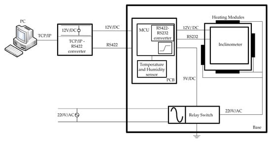 The communication protocol and wiring path of the measurement system are illustrated in Figure 5. A personal computer is connected to the MCU via a TCP/IP to RS422 bus converter, which then connects to the inclinometer through an MCU-encoded RS422 to RS232 converter, facilitating data transmission between the computer and inclinometer. The temperature and humidity inside the box, measured by the sensor on the PCB, are transmitted to the MCU in real time. Once the MCU acquires temperature data from the sensor, it will compare it with the pre-set temperature threshold. The MCU also includes a logic program to control the activation and deactivation of relays for heating or stop relays as a means of active temperature control. In this experiment, the heating temperature threshold was established at 30 °C. When the temperature falls below 30 °C, the MCU maintains relay closure to activate heating modules. Conversely, the relay is deactivated, and heating modules are shut down to ensure that the internal environment of the inclinometer remains close to 30 °C.