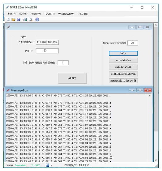 Our goal is to take full advantage of the high precision of the inclination sensor. An inclinometer measurement system with an environmental control box (ECB) is designed and tested based on the 25 m Nanshan Radio Telescope (NSRT). The NSRT (as shown in Figure 3) is located at the Nanshan Observatory in Urumqi, Xinjiang, China, and can operate at frequencies up to 43 GHz [,]. At present, the average pointing error of NSRT is greater than 15″. A stationary test was performed, which proves that the zero-point stability and repeatable accuracy with the application of the ECB are at the same level as those measured in an indoor environment. Multiple tests were conducted to demonstrate that the inclinometer measurement system is able to infer the pointing errors caused by the tilt of the alidade due to track unevenness and thermal gradients with satisfactory accuracy.