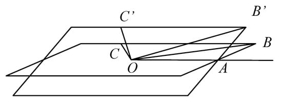 As illustrated in Figure 8, OAB denotes the installation plane of the inclinometer. While OA represents the optimal installation direction (i.e., parallel to the elevation axis of the antenna), the x-axis of the inclinometer is aligned with the OB direction and OC is perpendicular to OB, paralleling with the y-axis of the inclinometer. When the plane tilts around the OA, point B rotates to point B’, and point C rotates to point C’. The inclinometer output represents the rotation value around the OB axis, known as ∠COC’. However, our objective is to determine the angle of rotation, ∠B’AB, with respect to the direction of the pitch axis.