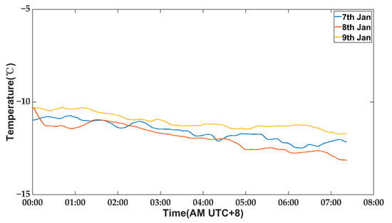 A stability test was conducted to calibrate and validate the zero-point stability of the measurement system. The antenna remained stationary for three consecutive windless nights, with a fixed azimuth angle of 70° and elevation angle of 90°. Ambient temperature data from these three nights were recorded, as depicted in Figure 9.