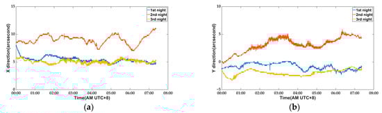 The data recorded by the inclinometer at three nights: (a) tilt in X direction; (b) tilt in Y direction.
