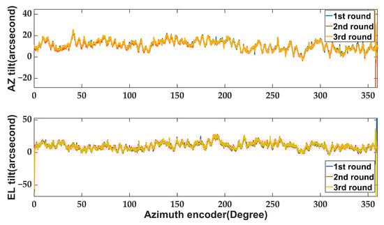 Figure 11 depicts the unfiltered raw data, which exhibits excellent repeatability in tilt meter measurements. This further validates the effectiveness of the inclinometer environment control system in mitigating external temperature drift-induced noise. The peaks observed at 0° and 360° are attributed to the antenna moment of inertia when starting and stopping, rather than noise. Table 3 presents the RMS values of antenna pointing errors in both elevation (EL) and azimuth (AZ) directions, which are derived from inclinometer measurement data using Equations (1) and (2).