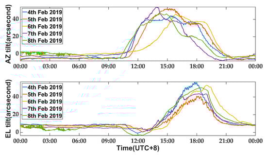 As depicted in Figure 12, the antenna alidade exhibits a relatively stable behavior during the non-sunlight period from 22:00 to 10:00. However, it experiences significant tilting between 10:00 to 20:00 due to the non-uniform temperature distribution caused by solar radiation. On average, the five-day experimental data showed an increase in AZ direction tilting at approximately 10:00, peaking at 53.4″ around 14:00, and gradually stabilizing after 18:00. From 10:00 to 18:00, an average azimuth error of 35.7″ was observed. In terms of EL direction tilting, it began at 12:00 and peaked at around 44.5″ by about 16:00 before becoming steady around 20:00. The average tilt in EL direction is 24.4″ between 12:00 and 20:00. It is evident that the onset and peak of EL tilting occur approximately two hours later than those of azimuthal error, which can be attributed to the relationship between antenna alidade orientation and apparent solar motion.
