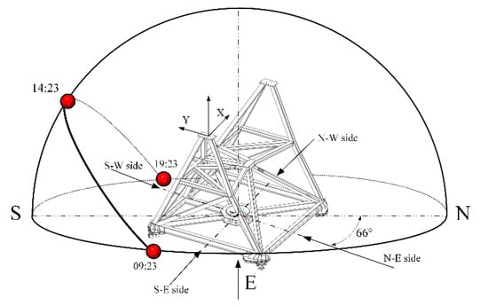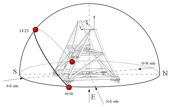 The inclinometer measurement system demonstrates a high level of agreement with astronomical observation measurements in terms of pointing errors, as illustrated by Figure 15. Even during the period from 12:00 to 18:00 when thermal gradients significantly impact the antenna alidade, the difference between pointing errors obtained through the measurement system and those derived from astronomical observation is only 2″ (RMS). It illustrates that the experiment exhibits thermally induced pointing errors, which peak earlier in the AZ direction than in the EL direction. This phenomenon is similar to that observed in Section 4.1 when the alidade was held stationary. Figure 16 depicts a schematic diagram illustrating the correlation between the apparent solar motion and the orientation of the alidade on 14 February. The rapid increase in antenna pointing errors after 9:00 is attributed to the sun’s illumination of the N-E side of the alidade post-sunrise, causing an elevation in temperature that surpasses other areas, thereby resulting in an initial rise in azimuth direction for pointing errors. As the sun gradually shifted to illuminate the southeast side, pointing errors in elevation direction increased rapidly. As it was noon at this time, the thermal gradients on the alidade intensified, resulting in greater pointing errors in elevation than azimuth direction.