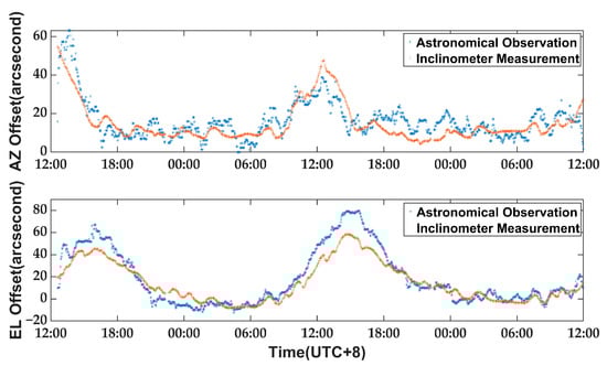 As the weather remained sunny and windless throughout the 48 h experiment, it can be inferred that thermal gradients were primarily responsible for the antenna pointing errors observed. The inclinometer measurement data were filtered and compared with astronomical observations to generate the curve depicted in Figure 15.