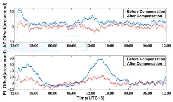 It is evident from Figure 17 that the pointing accuracy has significantly improved after compensation, particularly during the period from 14:00 to 17:00 when thermal gradients have the greatest impact on antenna performance. Table 4 presents a comparison of RMS values for pointing errors before and after compensation.