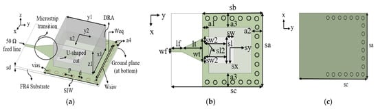 A 3D model view of a single port SIW with a DRA is shown in Figure 1a. A FR4 substrate ( = 4.6) with a loss tangent (tan ) of 0.019 and a thickness of 1.6 mm is used. Copper with a thickness of 35 μm is cladded on each side of the substrate plane, as depicted in Figure 1b,c. The proposed antenna has an input impedance of 50 Ω and is powered via a microstrip line. The volume of DRA is 40 × 40 × 21 with a permittivity of 10 and a loss tangent of 0.0019. The resonant frequency, at 1.8 GHz of the dielectric resonator due to the can be predicted using the Dielectric Waveguide Model (DWM) based on Equations (1)–(4) []:
