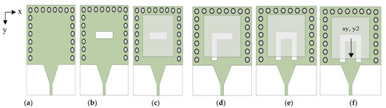 Six different antenna configurations of the single-port SIW with a DRA are investigated to resonate at 1.8 GHz, 2.6 GHz, and 3.7 GHz to cover the sub-6 GHz frequency for the 5G wireless communication system while also being backwards compatible with 4G bands. The evolutions of the proposed antenna in top view and reflection coefficient are depicted in Figure 2 and Figure 3, respectively. The far end of the SIW is terminated by equally spaced vias to form the feeding cavity []. Based on Figure 3a, the resonant frequency is greater than 4 GHz when there is no cut in SIW in Figure 2a. The next steps require the antenna to resonate at the targeted resonant frequencies.