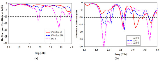 Comparison of the simulated reflection coefficient for evolutions of the proposed antenna (a) SIW without cut to ANT A (b) ANT B to ANT D.
