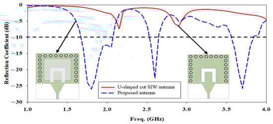 The reflection coefficient between the U-shaped cut SIW antenna and the proposed antenna has been compared in Figure 4. It clearly shows that the electromagnetic energy in the SIW cavity is optimal to couple to the DRA element through the U-shaped cut opening beneath it, which improves impedance matching by obtaining the widest bandwidth and lowest reflection coefficient at the three aforementioned frequency bands.