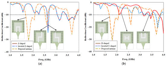 Comparison of the simulated reflection coefficient between U-shaped cut and the other shapes of SIW with DRA antennas (a) Z and inverted Z-shaped (b) H and inverted U-shaped.