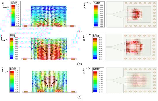 Figure 6 illustrates the electric field distributions in the DRA that are generated at the three mentioned frequencies to determine the resonant frequencies and the DRA’s operating mode. The proposed antenna resonates at 1.8 GHz, as shown in Figure 6a, due to the inner lengths of the U-shaped cut loaded by the DRA, and it induces the DRA’s mode. The same mode of DRA is also induced at 2.6 GHz, but in different directions, as shown in Figure 6b, and it is caused by the outer lengths of the U-shaped cut loaded by the DRA. As shown in Figure 6c, the DRA radiates at 3.7 GHz with mode while acting as a medium for radiation for the U-shaped cut at 1.8 GHz and 2.6 GHz.