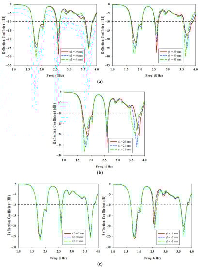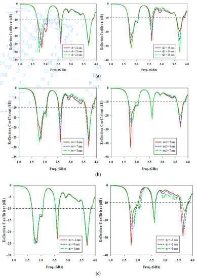 Firstly, the effects of U-shaped cut size and its position are studied to determine the best coupling to the DRA. Figure 7a shows the variations in the cut length for sl from 22 mm to 24 mm and sl2 from 19 mm to 21 mm, with a step size of 1 mm. By increasing sl, the resonance frequency of the lower frequency band (1.8 GHz) is affected only, and it is shifted towards the lower band. The optimum value of sl = 23 mm gives the required resonance frequency and the widest impedance bandwidth at 1.8 GHz. An increase in sl2 length introduces a mismatch in the reflection coefficient for all three frequencies as well as a shift in resonant frequency at the first and middle frequency ranges. When sl2 = 20 mm, it provides the best coupling of energy to the DRA element.