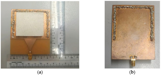 The top and bottom views of the prototype of the single port SIW with a DRA are shown in Figure 9a,b, respectively. The DR is made of ECCOSTOCK HiK dielectric material with a permittivity of 10, while the microstrip feeding line and ground plane are etched on a FR4 substrate with a permittivity of 4.6. The holes for the vias have been drilled and metalized. The prototype is excited by a female 50 Ω SMA connector.