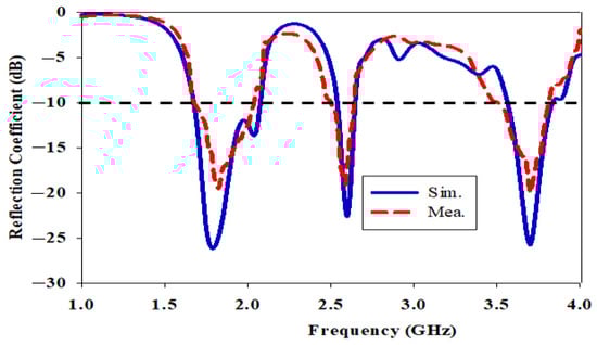 Figure 10 shows a comparison of the simulated and measured reflection coefficients using an impedance bandwidth reference level of −10 dB. As indicated in Figure 10, the prototype matches well at all three frequencies. At 1.8 GHz, the simulated and measured impedance bandwidths are 21.51% (1.670–2.070 GHz) and 19.50% (1.675–2.035 GHz) at 1.8 GHz, whereas they are 5.78% (2.520–2.670 GHz) and 6.58% (2.500–2.670 GHz) at 2.6 GHz. At 3.7 GHz, they are 7.57% (3.560–3.840 GHz) and 8.21% (3.505–3.805 GHz). Based on Figure 10, there is a slight difference in agreement between the measured results and the simulated results of the fabricated antenna. This is because imperfect fabrication and the adhesive glue that is used to stick the DRA to the substrate plane cause the air gap. The DRA does not radiate well, resulting in not achieving the full bandwidth. Table 2 tabulates each simulated and measured antenna parameter. Due to connector loss and imperfect fabrication, there is a slight reduction in gain in the measurement. The measured total efficiency is lower than the simulated one due to the lower gain and greater return loss in the measurement compared to the simulation.