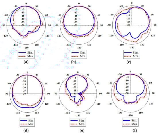All simulated radiation patterns point in broadside directions for all three frequencies except the E-plane radiation pattern at 2.6 GHz, which points at 45°, as shown in Figure 11c. This is due to the modification of the conventional horizontal cut in SIW, which changes the peak of the radiation pattern. The resonances at 1.8 and 2.6 GHz are caused by the U-shaped cut. The gain at 1.8 GHz is 5.0 dBi. However, the gain at 2.6 GHz is lower, that is, 4.5 dBi, and the beamwidth at 2.6 GHz is the largest because strong electric fields come from the top and bottom to the center of the U-shaped cut in SIW, causing a concentration of electric fields inside the inner of the U-shaped cut and cancellation of top and bottom electric fields in the xy plane, resulting in a reduction of gain and a smaller gain, as shown in Figure 6b. Due to the radiating of DRA, the frequency of 3.7 GHz has a directional radiation pattern in both the E-field and the H-field. As a result of the DRA resonance, a higher gain of 6.9 dBi is obtained. The beamwidth at 3.7 GHz is the narrowest when the highest gain is obtained. Figure 11 shows the E-plane and H-plane views of the normalized simulated and measured radiation patterns in the sequence of described frequencies. As indicated in Figure 11, there are some differences in the simulated and measured radiation patterns. These radiation patterns have deteriorated due to the disturbances of imperfect fabrication and connectors.