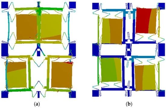 Figure 2 shows the structural simulation by ANSYS19.0. As shown in Figure 2a, when a DC bias with AC voltage is given to driving electrodes, the four-mass block moves due to the electrostatic force, and its driving mode is the same frequency reverse motion on the X-axis. When there is an input angular velocity on the Z-axis, the detection mode is generated by the Coriolis effect. The motion state is shown in Figure 2b as the same frequency inverse motion on the Y-axis.