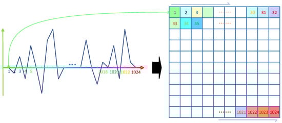 The normalized time series is reconstructed into an m × m two-dimensional matrix and a gray image is generated. The reconstruction process is shown in Figure 4, and to increase the image informativeness, the generated grayscale image is converted to a pseudo-color image as shown in Figure 5. In this paper, m was taken as 32.