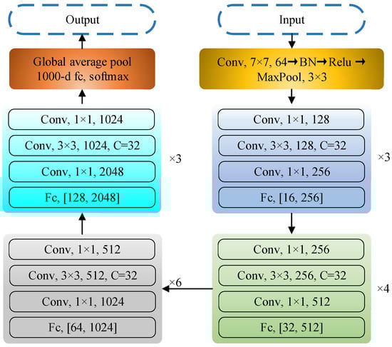 SENet, the champion model of ImageNet 2017, was proposed by Jie Hu et al. [22] through the “Squeeze-and-Excitation (SE)” module, which dynamically adjusts the response value between channels of the model and assigns the importance between channels. ResNeXt [23] combines block and split-transform-merge strategies by learning the advantages of VGG and ResNet. SEResNeXt retains the multibranch structure of ResNeXt and improves the performance of deep learning by introducing the attention mechanism of the SE module and keeps the number of parameters low. As shown in Figure 6, the SE module is applied to the residual branch. The overall framework diagram of the network is shown in Figure 7.