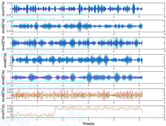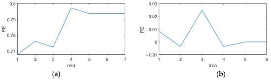 First, the original signal was denoised according to the IEWT algorithm, which decomposes the signal in the process as shown in Figure 11. For its decomposition result mra, if the number of mra is 2, the first component is considered as the noisy signal and the second component as the valid signal. If the number of mra is greater than 2, its respective multiscale permutation entropy is calculated, and PEs are obtained. Derive PEs, and the position of the index number +1 of the last extreme point of the PEs is considered as the dividing point, and the component after the dividing point is the valid signal. The multiscale permutation entropy of the signals in Figure 10 is calculated as shown in Figure 11, and according to Figure 12b, the 5th position is considered as the demarcation point. The 6th and 7th components are considered as valid signals. The reconstructed signal was compared with the original signal, as shown in Figure 13. The reconstructed signal was applied to the method in Section 3.3, and the reconstructed image is shown in Figure 5.