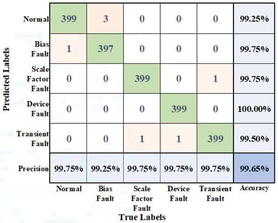 To show the experimental results in more detail, a confusion matrix was drawn to visualize the classification results. The visualization results are shown in Figure 15, where it can be seen that the average recall rate is 99.65% and the precision rate is 99.65%.