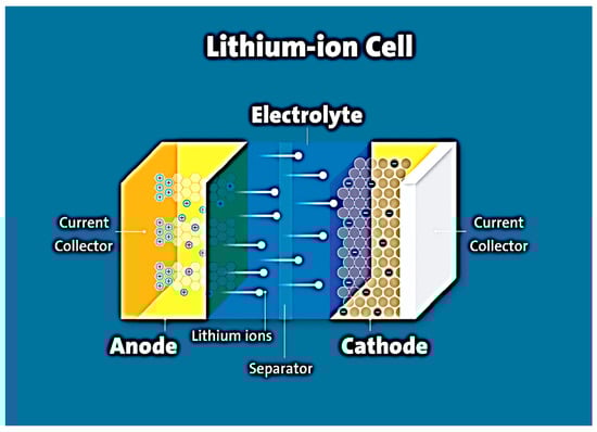 A battery consists of three components: electrodes, electrolyte, and current collectors. The positively charged electrode (cathode) provides lithium cations inside the cell (charging process), the electrons being transported through an external electric circuit. The negatively charged electrode (anode) generates lithium ions (Li+) into the electrolyte, which are absorbed by the cathode during the discharge process [4]. Lithium, lithium iron, or cobalt oxides are usually used as the cathode, and carbon materials (graphite, carbon nanotubes (CNT), hybrid carbon materials, etc.) are used as the anode [3,4] The cathode material and the anode material, applied to copper foil or nickel foam, are separated by an electrolyte-soaked separator. The electrolyte most commonly used is a liquid solution containing a lithium salt (LiPF6, LiClO4) dissolved in an organic solvent or mixture of organic compounds (dimethyl carbonate, ethylene carbonate, etc.), which allows lithium ions to diffuse from one electrode to another [5]. The electrolyte must be stable in the presence of both electrodes. Current collectors are usually made of metal (copper, aluminum, etc.). During battery charging, lithium ions intercalate into the carbon material. As a result, the cathode material is oxidized and the anode material is reduced. During the discharge of the lithium-ion cell, the anode is electrochemically oxidized, thereby releasing lithium ions. At the same time, electrons pass through the external circuit to the cathode. When the battery is recharged, the reverse process occurs. The characteristics of the battery depend on the chemical composition and structure of the anode and cathode and therefore on the parameters of the electrochemical processes in the battery. A diagram of a lithium-ion battery is shown in Figure 1.