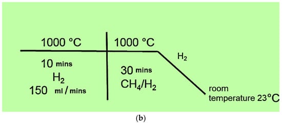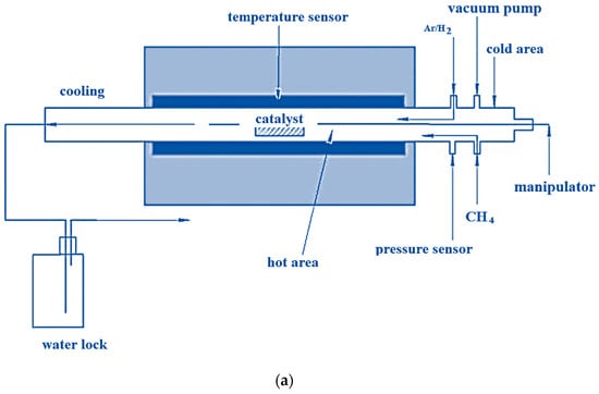 A tubular reactor was used for CNT synthesis, the scheme of which is shown in Figure 2a. The reactor casing is a stainless steel tube with a removable quartz tube 30 mm in diameter and 1 m long inserted inside. To one end of the reactor vessel is attached a feed block, which has outputs through which various substances (inert gas, carbon source, hydrogen, etc.) and a pressure sensor are injected. A movable manipulator is connected through the feed block, which allows the introduction of the catalyst into the center of the quartz tube at any time of the process. The reactor volume is evacuated through the feeder unit. A thermos regulator controls the temperature in the reactor. A schematic of CCVD synthesis of CNT is shown in Figure 2b.