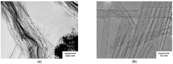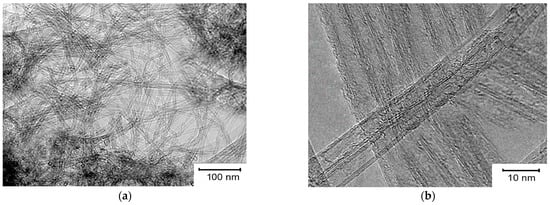 Low- and high-resolution TEM microphotographs of CNTs, respectively, synthesized using catalyst 1 at the flow rate of methane 200 mL/min; (a)—bilayer carbon nanotube fibers; (b)—bilayer carbon nanotube fibers vertically and multilayer carbon nanotubes horizontally.