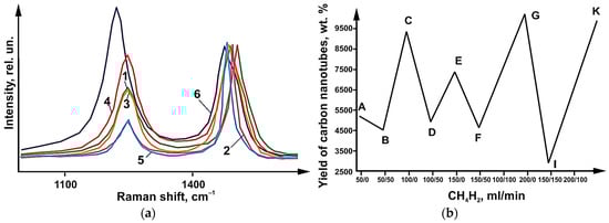 (a) CRT spectra of carbon nanotubes synthesized using catalyst 1 at total CH4/H2 flow rates 50 (1—50 CH4/50 H2), 100 (2—100 CH4; 3—100 CH4/50 H2), 150 (4—150 CH4), 200 (5—200 CH4) and 300 mL/min (6—300 CH4). (b) Effect of the ratio and flow rates of CH4/H2 gases on the CNT yield and I value SD/IG.