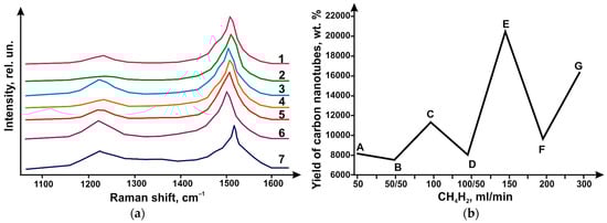 (a)-CRT spectra of synthesized carbon nanotubes (using catalyst 1) at different flow rates of CH4/H2. The graph shows the following flow rates: 50 (1—50 CH4; 2—50 CH4/50 H2), 100 (3—100 CH4; 4—100 CH4/50 H2), 150 (5—150 CH4), 200 (6—200 CH4) and 300 mL/min (7—300 CH4); (b)-CNT yield depending on the ratio and flow rates of CH4/H2.