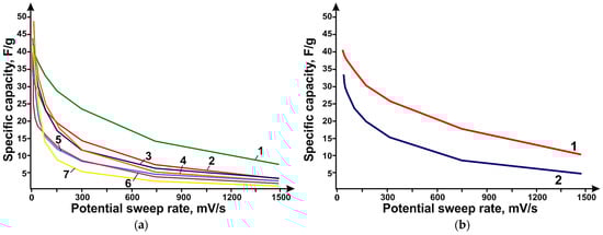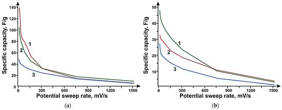 Dependence of specific capacity of electrodes based on: (a)—PC (Curve 3), N-PC (CaO) (Curve 2), N-PC (MgO) (Curve 1); (b)—on CNT (Curve 3), DLCNTs (Curve 1) and MWNT (Curve 2) on potential sweep speed.