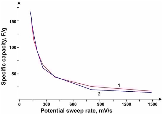 The studies showed that the sample obtained at a methane flow rate value of 150 mL/min on catalyst 1 had the highest specific capacity over the entire range of sweep rates. Carbon nanotubes obtained using catalyst 1 showed higher values of specific capacitance over the whole range of sweep rates compared to nanotubes synthesized using catalyst 1, which may be due to the higher specific surface area, which are 379 and 285 m2/g, respectively. Cyclic volt-amperogram curves show peaks at ~350 mV. These peaks appear on the charge curve at ~550 mV. On the discharge curve, they appear at ~240 mV. These values are associated with reduction of molybdenum (Mo+6) to its intermediate oxides (MoOx) and correspond to redox processes. For the stopping molybdenum oxides, x is between 2.4 and 3.2. Figure 7 shows the dependence of specific capacity, where CNTs synthesized using catalyst 1 at total flow rates of methane/hydrogen mixture; (b) CNTs synthesized using catalyst 1 and 2 at flow rates of CH4 200 mL/min.