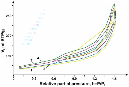 To describe the electrochemical processes of N-PC (MgO)/OUNT, DLCNT, and MWNT hybrid materials, the porous structure of the hybrid materials was analyzed via nitrogen adsorption using a “Sorbi MS” instrument. Before the measurement, the carbon material was annealed in an inert atmosphere using “Sorbi-MS” equipment at 160 °C for 1.5 h.