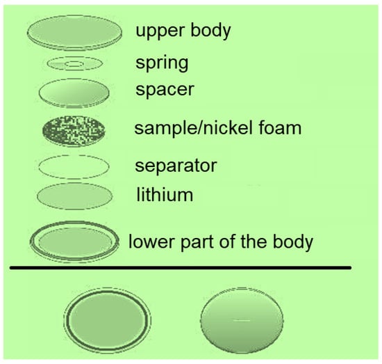 The technology of making electrodes for measuring the charge–discharge processes in lithium-ion batteries consisted of the application of carbon material to the foam-nickel acting as a current collector. For this purpose, the carbon material was homogenized with the binder polyvinyl difluoride (PVDF-2) in N-methylpyrrolidone. Afterward, the resulting mixture was smeared on the foam nickel and dried at 60 °C for 12 h. During the last stage, the electrodes were compressed and two-electrode metal cells (CR 2025 form factor) were assembled. Testing of obtained electrodes in lithium-ion battery was carried out using “Neware BTS-5000” charging–discharging stations in galvanostatic mode from 0.01 to 2.50 V with respect to Li/Li+ at different current densities by the following procedure: 10 cycles at current densities of 100, 250, 500, 1000, 100 mA each. The layout of the cell assembly for testing is shown in Figure 11.