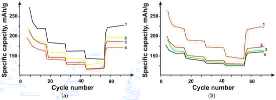 Changes in the specific capacity of carbon materials when the current densities change 100 mA/g, 250 mA/g, 500 mA/g, 1000 mA/g, 100 mA/g for hybrid materials (a) based on N-PC (CaO) (Curve 3), N-PC (CaO)/OUNT (Curve 4), N-PC (CaO)/DUNT (Curve 1), and N-PC (CaO)/MUNT (Curve 2) with a component ratio of 95:5 wt%, (b) based on N-PC (MgO) (Curve 4), N-PC (MgO)/OUNT (Curve 2), N-PC (MgO)/DUNT (Curve 1), and N-PC (MgO)/MUNT (Curve 3) with a 95:5 wt.