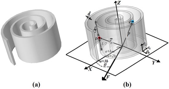 Here, following refs. [25,26], we concentrate on particular rolled-up nanostructures, assuming that cross sections of the RUQWs along the XOY planes are spirals given in polar coordinates by the Archimedean equation ; with . The arc length s and the curvature radius of this curve depend on the polar angle as follows: