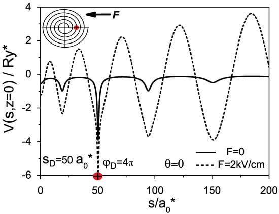 The four terms in the potential energy (3) correspond to the following contributions: from the lateral confinement inside the nanolayer, from the curvature variation along the spiral [26,27], from the external electric field and from the electron–donor attraction, respectively. In Figure 2, we show curves of potential energies given by the relations (1)–(3) for the Archimedean spiral with parameters , and with the donor located at the point with polar coordinate . The solid line corresponds to the zero-electric field case, while the dash line corresponds to the case kV/cm. One can see in Figure 2 an essential change of the curve of the potential energy, which, in the presence of the external electric field, obtains a form of oscillation with increasing amplitude along the spiral arc. Such modification of the potential can induce, as we show below, a strong polarizability and the formation of a giant dipole moment in the ground state of the shallow donor. To explain how the increasing external electric field applied along the X-axis can induce a giant permanent moment in a donor, we display in Figure 3 some plots for the electron (a) and for the donor (b), which show a successive evolution of the potential curves along the spiral at the cross section .